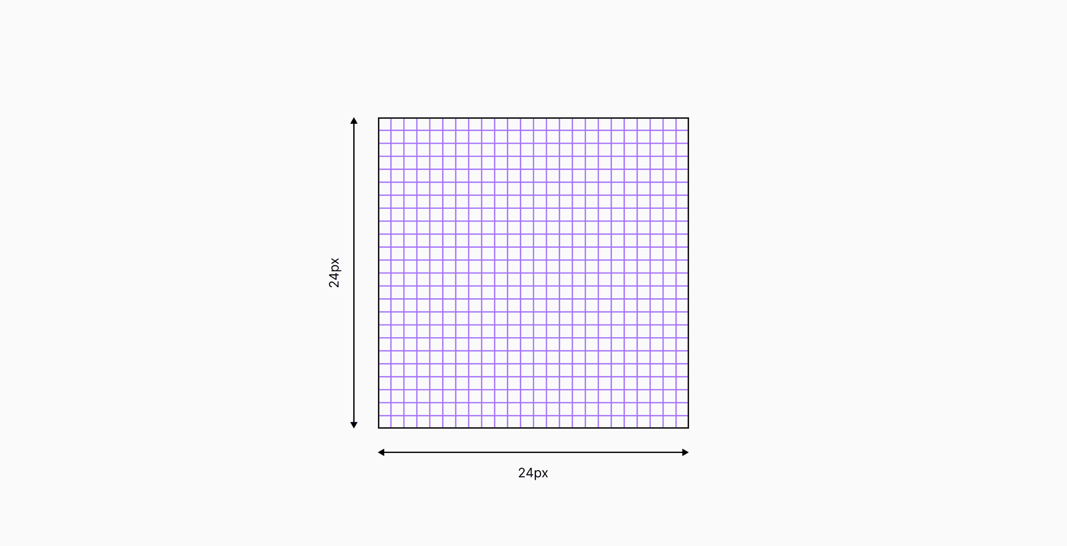 The grid guides major proportions and alignments. It's a structure of small squares formed by overlapping horizontal and vertical lines, creating units across the frame. Larger icons may use two grids: a primary (larger) grid for overall proportions and a secondary (smaller) grid for finer detail.