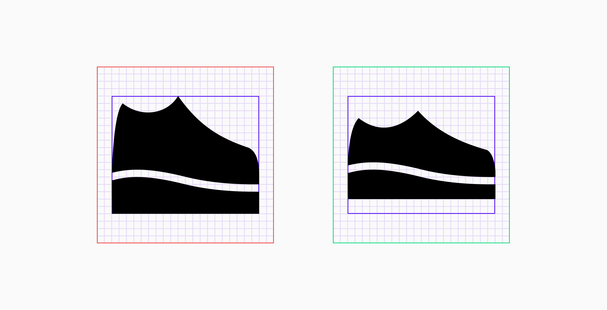 If fitting an icon into a keyline could affect that clarity of the icon, choose clarity over being consistent with the grid or keylines. In the image above, trying to fit the shoe into the wide rectangle affects the clarity.