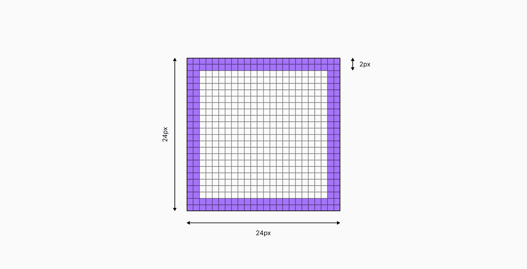 The frame marks the icon's boundary, acting as a container for all design elements. It determines your icon's size, which is uniform across a set. Frames come in various sizes, chosen based on project's needs and icon's function. Common sizes are 16x16px, 24x24px, and 48x48px. Any elements outside the frame may appear misaligned or cropped.